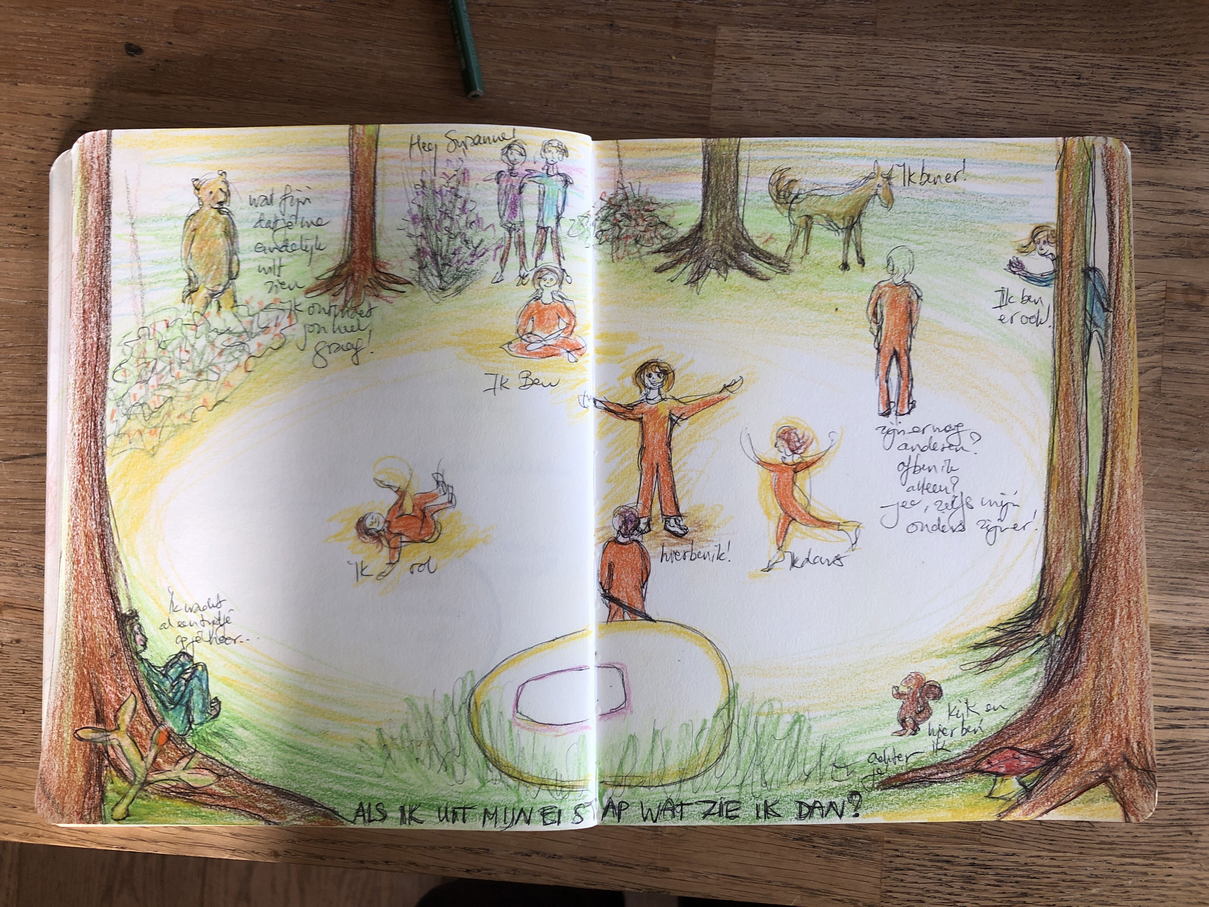 Laat ik nou het begin zijn van deze plek. Zonder plan, met mezelf en met jou Alles wat we nodig hebben is voorhanden Luisteren, luisteren, luisteren tot we weer horen Leven laten stromen van binnenuit naar buiten Prachtige bewegingen, klanken, tekeningen, gesprekken laten ontstaan