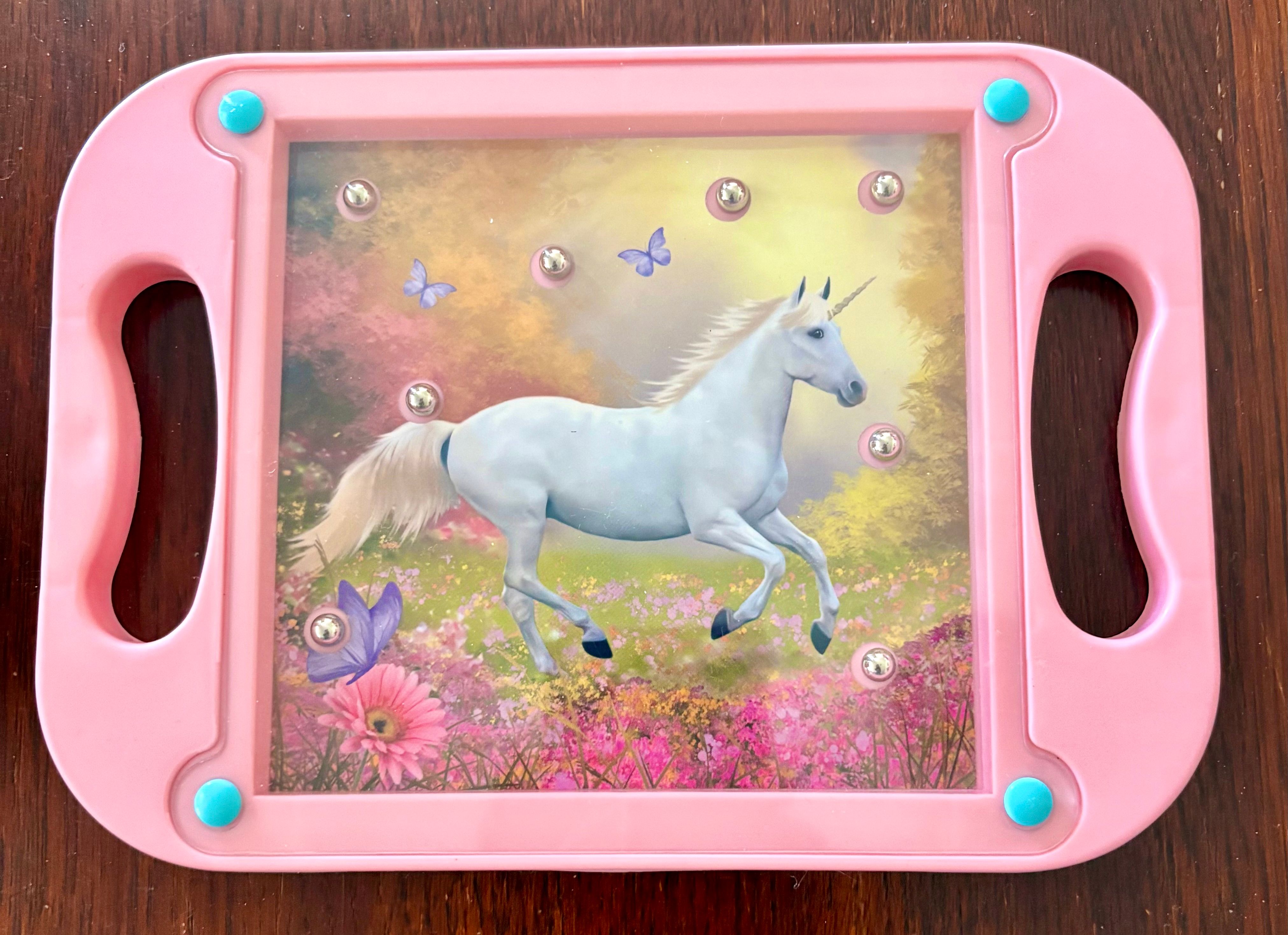 Soms gebeurd het dat je plots wordt getriggerd door iets wat je ziet liggen in de winkel en dat daar dan een heel fijn gevoel bij vrij komt. Een kinderspelletje waarbij je de zilveren balletjes in de gaatjes weer moet zien te krijgen. En dan ook nog eens een leuke Eenhoorn er op ziet afgebeeld,dubbel zo leuk en vooral veel speelplezier.😁