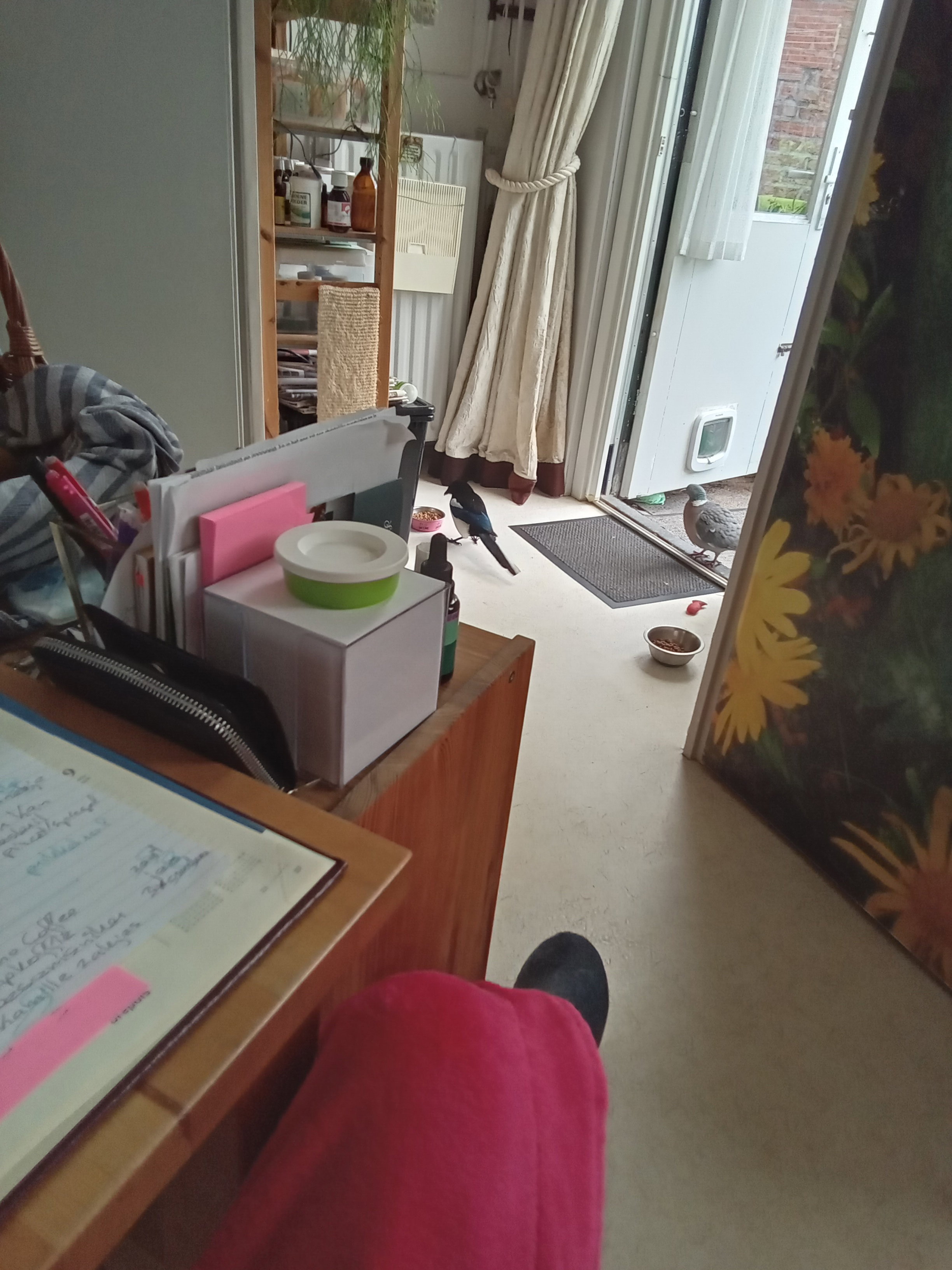 ... dan krijg je wonderlijk gezellig bezoek . Helaas zijn er geen bewegende beelden te plaatsen anders had ik ook het korte filmpje van de reiger die mijn woonkamer binnenliep kunnen plaatsen. En de nieuwsgierige houtduif die heen en weer door mijn woonkamer wandelde om eens te zien hoe ik woon. Of de 2 kibbelende duiven rondom de kattenbrokjes. Of hoe buurkater, duif en ekster letterlijk een meter van elkaar wachten op hun knabbelmomentje. Wonderlijk samenwonen, het kan!